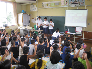 和綿の栽培記録発表 投稿日時 : 2017/09/12 投稿者5 9月7日(木)⑥限目、生活経営科3年のプロジェクト班が免田小学校で和綿の栽培記録を発表しました。6月に免田小の3年生と南稜高校の畑に種をまいた後、順調に成長していく様子を写真で説明しました。和綿の種や葉、花のクイズには小学生たちも楽しみながら、たくさん手を挙げて答えてくれました。最後は質問タイムで、コットンボールの大きさや綿繰り機などについて答えました。次回は、和綿ものづくり交流会を計画しています!