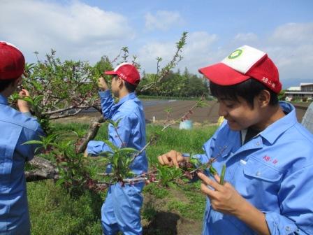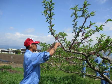 園芸科学科果樹農場実習 投稿日時 : 2018/04/11 投稿者2 春の訪れ、気温の上昇とともに果樹の生育も盛んになります。本日の実習はブドウの摘芽、モモの摘花です。品質を上げるために新芽や開花後の花を間引いていきます。今後の成長が楽しみです。