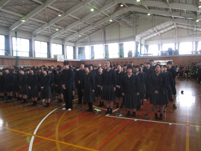 ・新任式・始業式 (2018/4/9) 投稿日時 : 2018/04/09 学校サイト管理者 ・新任式・始業式 (2018/4/9)4月9日(月)新任式・始業式を行いました。始業式では、校長あいさつの中で「凡事徹底」、「目標」を立てよう、「みんな仲間だ」との話がありました。吹奏楽部の演奏による校歌斉唱。閉式後、部長、担任等の発表。生徒会から「いじめ撲滅」についての話がありました。校歌斉唱各部長、担任 等の発表いじめ根絶について