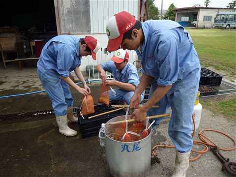 南稜米栽培 塩水選・温湯消毒 投稿日時 : 2018/05/01 学校サイト管理者 5月1日、南稜米栽培がいよいよスタート。種籾の塩水選と温湯消毒を行いました。 塩水選は、塩水を用いて充実した種籾を選別することです。浮かんだ種籾を取り除きます。 温湯消毒はいもち病等の予防のために行います。60度のお湯で10分間殺菌をします。 消毒した種籾は、水で冷やします。 うまくできたでしょうか!?今後の成長に期待です。