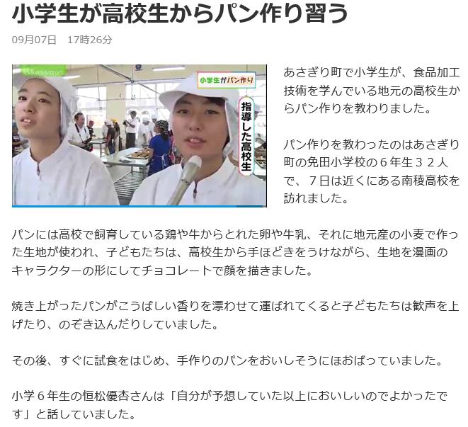 ・パン作り教室NHK放送 (2018/9/7) 投稿日時 : 2018/09/07 学校サイト管理者 ・パン作り教室NHK放送 (2018/9/7)9月7日(金)免田小学校6年生と行いましたパン作り講習会の様子が、NHK「クマロク!」で放送されました。