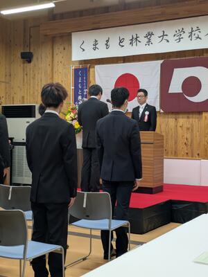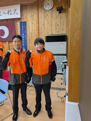 【総合農業科】令和8年度くまもと林業大学校【長期課程】入校式 投稿日時 : 13:45 学校サイト管理者 4月14日(火)、熊本県林業研究・研修センター「森創館」においてくまもと林業大学校の入校式が行われました。3月に総合農業科を卒業した杉本さんと鶴本さんが入校しました。これから約200日間の研修を積み、将来、「山の人材」として、森林・林業の現場での活躍が期待されます。入校生を代表し、杉本さんが、代表宣誓を行いました。(昨年度の中原さんに次ぎ、南稜高校卒業生が2年連続で代表宣誓)