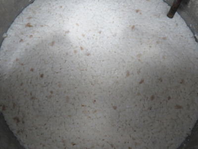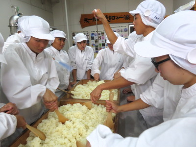 プラント焼酎の製造(常圧蒸留)~その3「二次仕込み」~(2018/10/12) 投稿日時 : 2018/10/15 投稿者4 食品科学科3年生が行っている、プラント焼酎の製造。一次仕込みから1週間後の今日は、二次仕込みを行います。 一次仕込みから2日目のもろみでは、米の粒が残っていますが・・・ 1週間後には米の原形がほとんどなくなり、アルコール臭も強くなっていました。 一次もろみと汲水を二次仕込み用の発酵タンクに移します。 温度計で確認しながら、蒸した米を適温まで冷却します。温度が高すぎても、低すぎてもいけません。 一次仕込みのときと同様、全員の手で蒸した米をタンクに投入します。順調に発酵が進むよう、しっかりともろみの管理を行っていきましょう。 仕込んだ二次もろみは2週間かけて発酵させ、26日(金)に蒸留を行います。