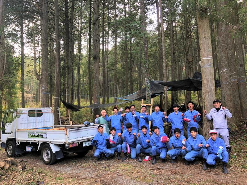 新3年生15名は、昨年度先輩方が接種し伏せ込んだ原木を合掌形にほだ起こしをし、