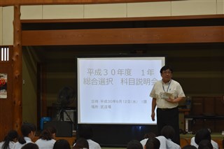 ・1年総合選択科目説明会 (2018/9/12) 投稿日時 : 2018/09/12 学校サイト管理者 ・1年総合選択科目説明会 (2018/9/12)9月12日(水)1限目、武道場で、1年生を対象に、総合選択科目説明会を行いました。他の学科の専門科目、普通科目、商業科目を選択できます。専門科目 グリーンライフ、微生物利用、食品製造、農業機械、生活と福祉、測量、林産物利用普通科目 国語表現、政治・経済、英語表現Ⅰ、音楽Ⅱ、書道Ⅱ、スポーツⅡ商業科目 マーケティング進路などしっかり考えて選択してください。