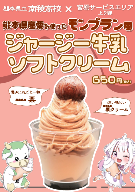 九州自動車道宮原サービスエリア(上下線)において、生徒が考案した2品が令和5年9月14日(木)から限定販売されます。販売開始当日の令和5年9月16日(土)には、ソフトクリームを考案した生徒が宮原SAにてPR活動を行います