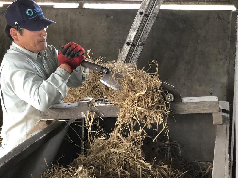 写真は切った後のワラです。ウシが食べやすい長さ、5㎝~10㎝にきれいにそろったワラを見たとき、職人としての繊細さを感じました。