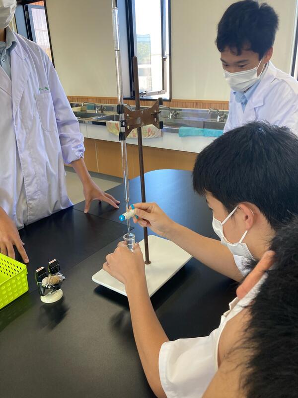 滴定を行います。まぜながら、『一滴ずつ』など細かなアドバイスも2年生が行いました!