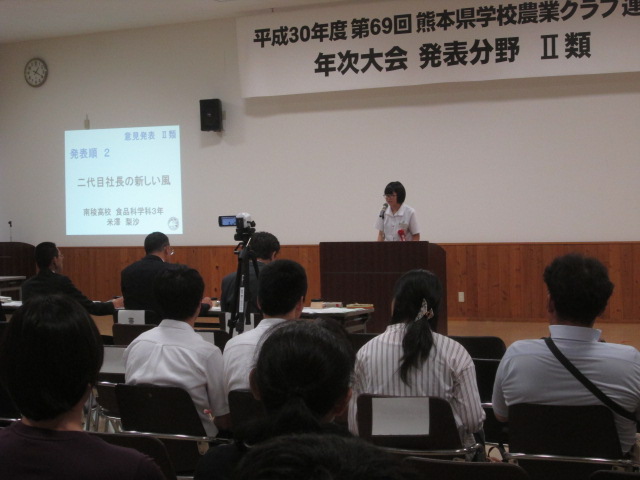 ・熊本県学校農業クラブ 年次大会【1日目】 (2018/6/20) 投稿日時 : 2018/06/20 学校サイト管理者 ・熊本県学校農業クラブ 年次大会【1日目】 (2018/6/20)6月20日(水)~21日(木)第69回熊本県学校農業クラブ連盟年次大会が玉名市民会館で行われました。南稜高校からは、すべての部門に出場。【意見発表】Ⅰ類 生産科学科3年 椎葉さん 「生きがい」Ⅱ類 食品科学科3年 米澤さん 「二代目社長の新しい風」Ⅲ類 環境工学科3年 邉見くん 「緑を活かす看護師を目指して!~森林の癒し効果を、多くの人々に~