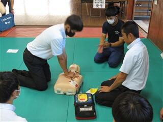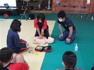 この講習会は昨年度12月にボランティア部員の1人が「AEDが使用できる生徒が少しでも増えてほしい」という思いで企画したもので、72人の生徒の受講希望がありましたが、新型コロナウイルス感染症の拡大防止のために定員20人ずつ4回に分けて開催することになり、更に感染状況の悪化により延期となっていたものです。先月9月いっぱいで蔓延防止等重点措置の期間が終了し、今回の4回目の実施で、ようやく昨年度に受講を希望していた生徒達全ての受講がかなったことになります。