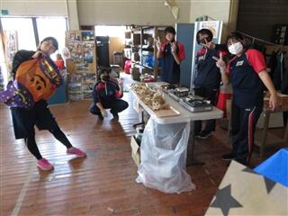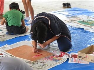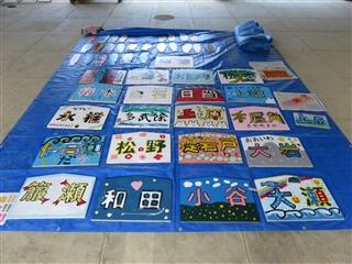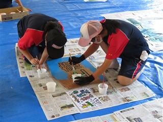 午前中は、秋祭りの会場設営、各地区の看板作り、料理作りの大きく3つの班に分かれて手伝いをしました。秋祭りの会場ではテント立てや検温・手指消毒の手伝い、看板作りでは地元の子ども達と一緒にペンキの色塗り、料理作りではマダムチームの皆さんの調理したものの盛り付けをしました。