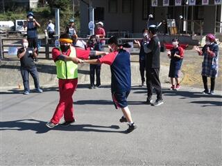 その後の秋祭りでは、ステージでカラオケによる歌を歌いながら会場を盛り上げ、地域の方々と一緒に輪になって盆踊りを踊りました。
