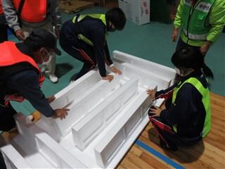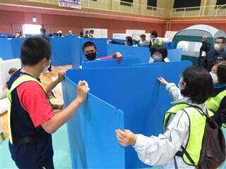 まずは、避難所開設訓練として、住民の方々と一緒に3つの班に分かれてベッドとパーテーションの組み立てに取り組みました。青いパーテーションを班ごとに1列に並べ、その中に発泡スチロール製のベッドを1脚ずつ入れました。