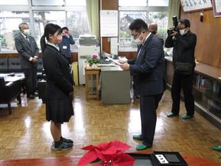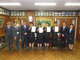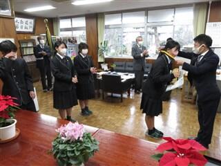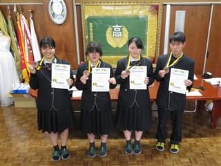 表彰式は、熊本県教育公務員弘済会より専任幹事の和久田恭生様、ジブラルタ生命保険株式会社の熊本支社より支社長の卜部良樹様、同じく人吉営業所より所長の三木田史郎様、担当の別府太基様、西田綾子様に御出席いただき、本校校長室で行いました。受賞者と部長には表彰状が手渡され、メダルが首に掛けられました。