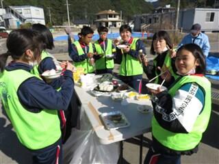 昼ご飯時には、パールラインライオンズクラブの方々が準備された海鮮バーベキューを楽しませていただきました。また、上天草高等学校(上天草パールレオクラブ)の生徒達が油で揚げてくれた南稜高等学校生産のサツマイモも振る舞われました。
