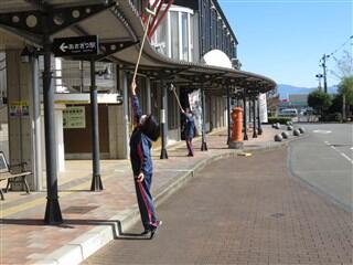 今回は部員2人で活動に取り組みました。1年以上も列車の運行が止まっているためか、駅舎の屋根には蜘蛛の糸がたくさんかかっています。そこで今回は、主に蜘蛛の巣払いに取り組みました。