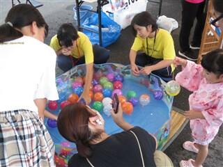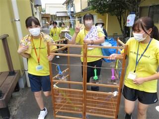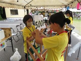 当日29日(土)には7名の生徒が参加し、主に会場係と縁日係を担当しました。会場係の生徒は、夕立の降った後に長机やパイプ椅子を拭いたり、ステージ発表をする団体の道具を運んだりしました。縁日係の生徒は、来場者におもちゃのお面や光る剣を販売したり、ヨーヨー吊りの対応をしたりしました。