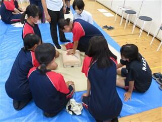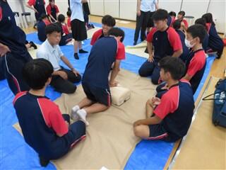放課後に部活動及び同好会の生徒を対象とした救急法講習会が開催され、ボランティア部員8名が進行及び講習を務めました。