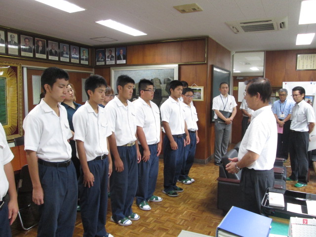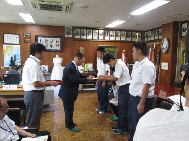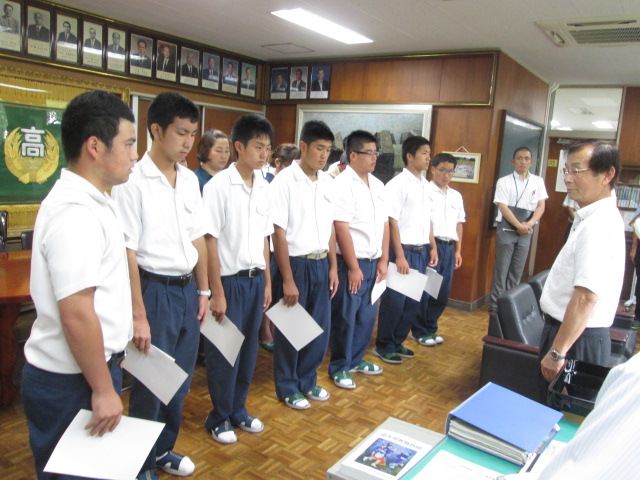 7月16日(木)午後4時から校長室で、球磨林業奨学会 上半期奨学金交付式を行いました。3年環境工学科 林業コース4名、2年環境工学科 林業コース4名に、堀川会長から交付金が受給されました。