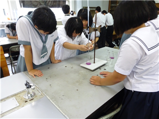 酸とアルカリの反応による色の変化の実験です。普通科総合コースの生徒もサポーター役として実験のお手伝いをしました。