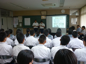 まず、普通科総合コースの内容と総合的な学習の時間「クリエイト」についての発表をスライドを使って行いました。