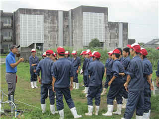 生産・園芸科学科1年生の農場実習です。暑さに負けず、先生の熱い話を熱心に聞いています。