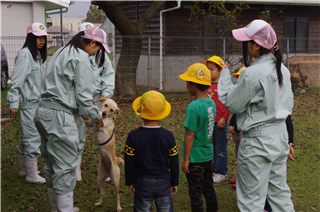 災害時に、まず自分の身を守れるよう、みんなで一斉に訓練実施。