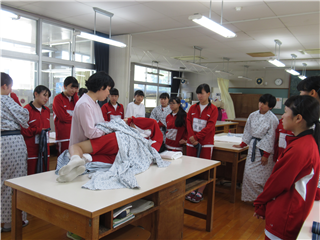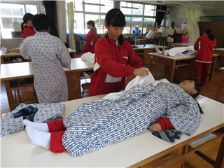 本日2時間目、3年生活経営科 科目「生活と福祉」では、着脱衣の介護実習を行いました。