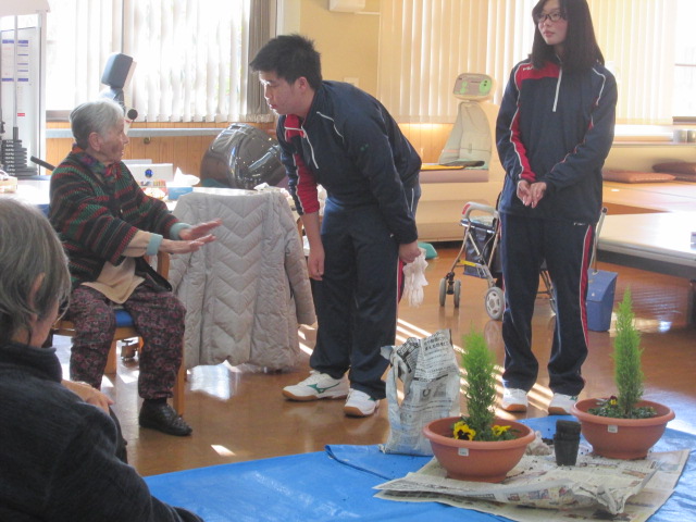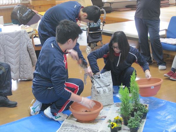 1月12日(金)1年普通科福祉コースの生徒が、「ディサービス事業所における寄せ植え交流」を行いました。園芸福祉・園芸療法学習の一環として、あさぎり町内のディサービス事業所で、寄せ植えを体験しました。SPH(15)の取組の一環でもあります。