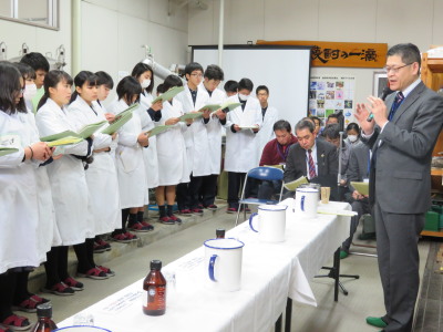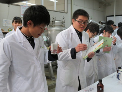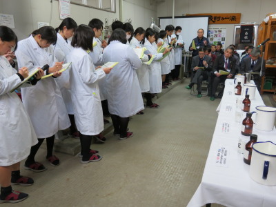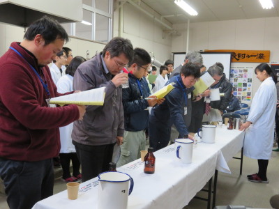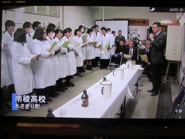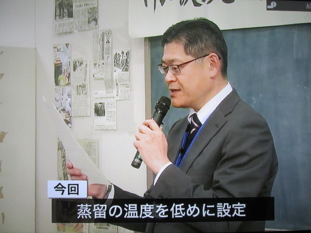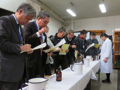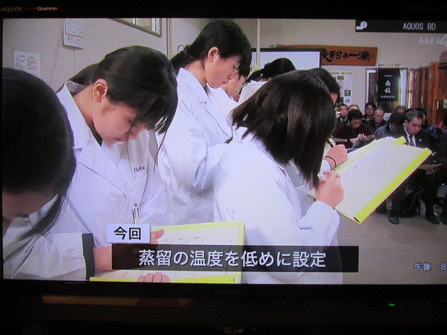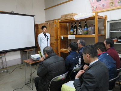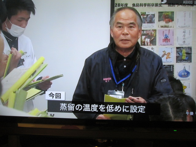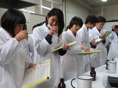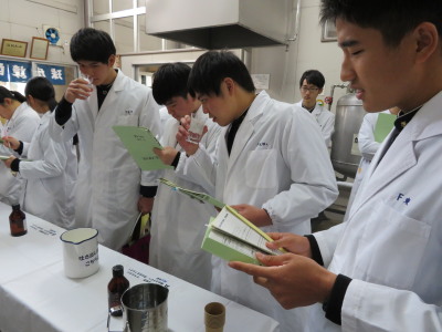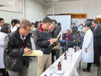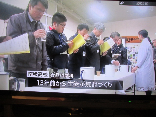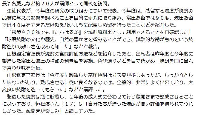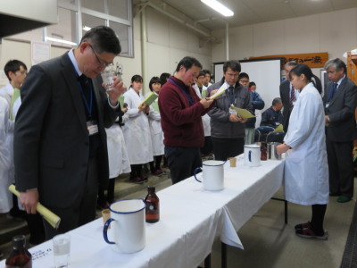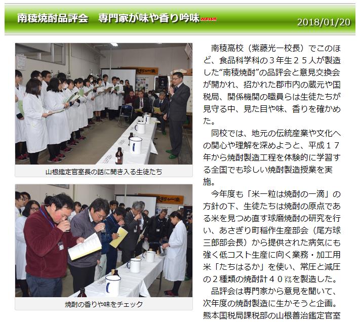 球磨郡あさぎり町にある県立南陵高校の生徒が作った焼酎の品評会が12日、開かれた。品評会では地元の酒造会社の社員や米の生産者、国税庁の職員らが未成年の生徒に代わってきき酒をした。南陵高校の食品科学科では13年前から球磨焼酎の研究を始め毎年様々な課題を設けて焼酎を作っている。今年度は、去年10月から11月にかけて仕込みを行い、発酵の温度や糖度を計測しながら、今回は蒸留の温度を低めに設定して作ったという。きき酒をした国税庁の鑑定官は「華やかな香りと甘味がある」などと評価