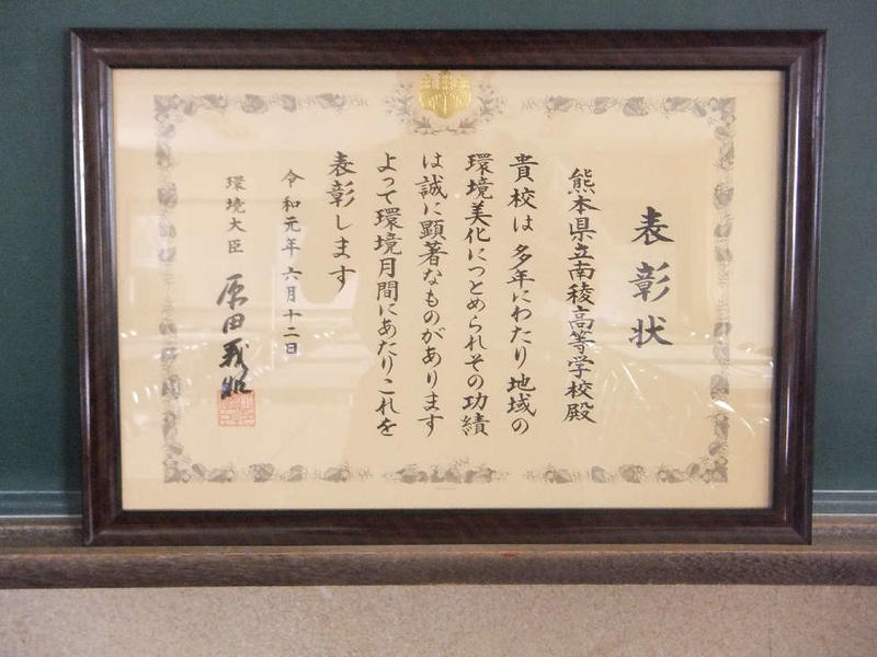 この度、本校の「ボランティア活動」「学校版ISO取得」「歩こう球磨を潤す農業遺産」「水の国高校生フォーラム」「あさぎり町美化パートナープログラム」など各種活動を実績が評価され、地域環境美化功績者表彰を受賞しました。