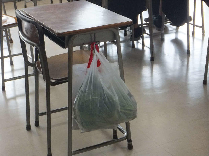 総合農業科3年生の教室の風景です。自分で栽培し、収穫した野菜を大切に机に掛けています。放課後持ち帰り家族で食べるのでしょう。どんな調理になって家族を喜ばせてくれるでしょうか。栽培の過程や学校での出来事などの会話も楽しい夕食にしてくれますね。