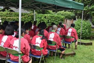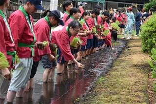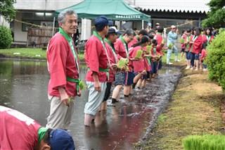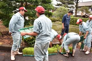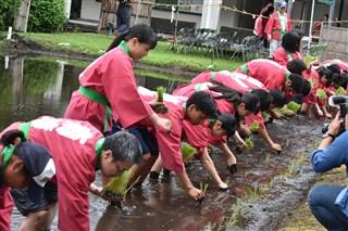本日、本校の三福田で、恒例の御田植祭が行われました。小雨の中、育友会の方々、校長、教頭、事務長それに生徒会、農業クラブの有志が参加して行われました。太鼓に合わせて一斉に皆、一線上に餅米の苗を植えていきました。