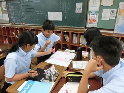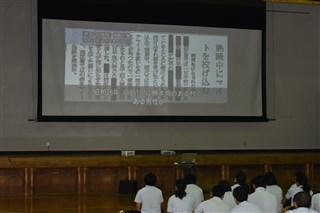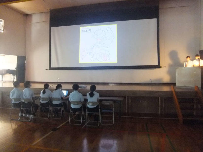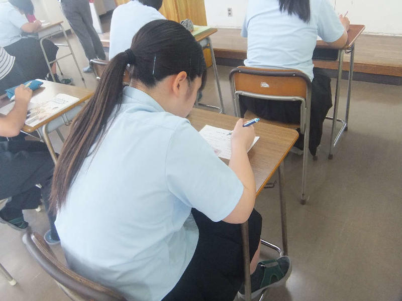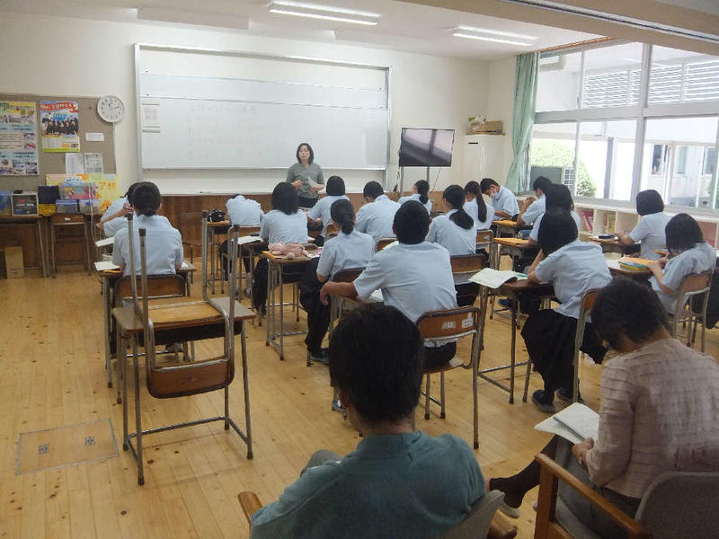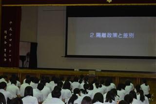 本日、1限目に2学年の人権学習がありました。菊池惠楓園のハンセン病の差別問題について学習しました。学年担当の森田先生の話の後、皆、真剣に話に聞き入っていました。