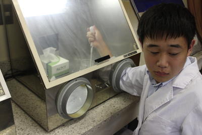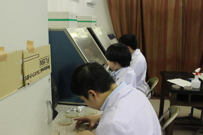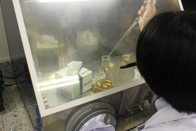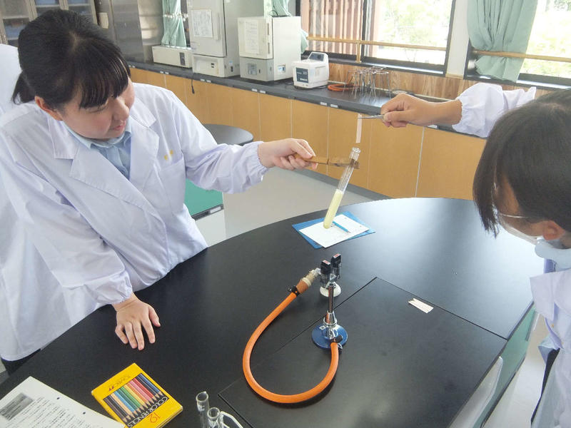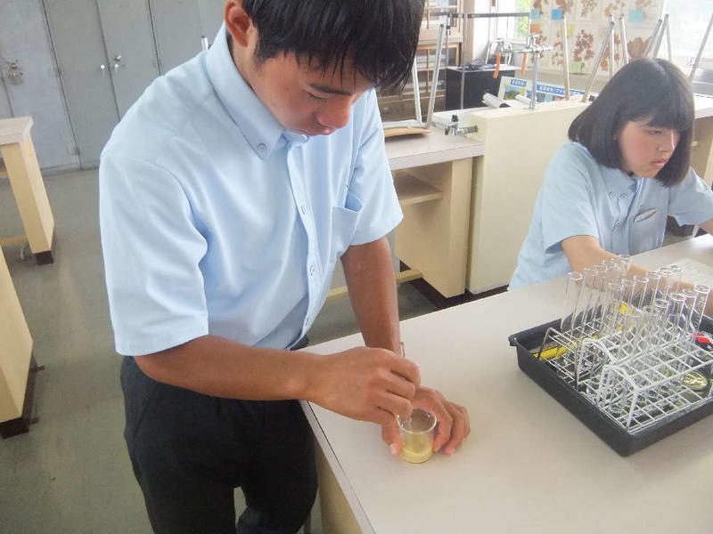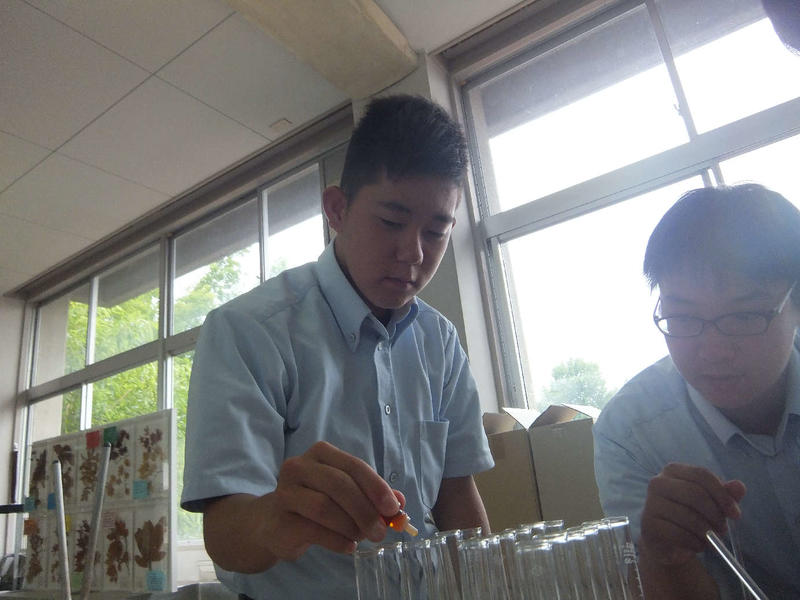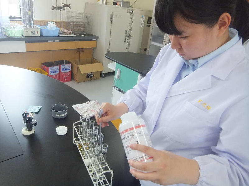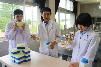 ぶどうの木の常在菌を確かめるため、寒天培地を作成しています。慣れない作業で戸惑いながらも実験の準備を進めています。