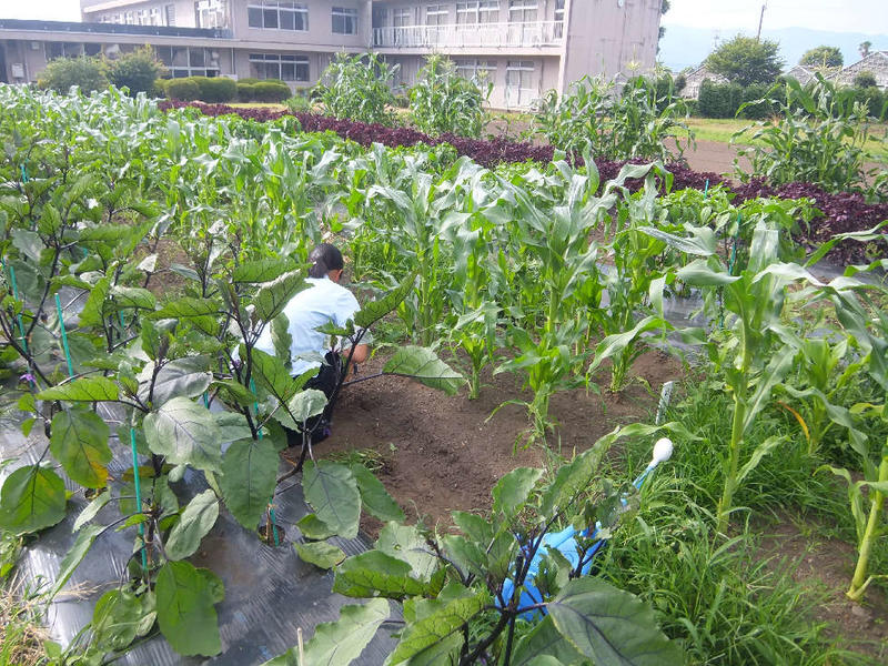 圃場の一角をのぞいてみたら一人の生徒が黙々と管理作業をしていました。放課後の時間を使って自身が育てている野菜の管理に来たそうです。「草が伸びると管理しずらくなりますから・・・」見ると彼女の所だけ草が生えていません。きっと一番良い野菜が育ちますよ。頑張ってください。