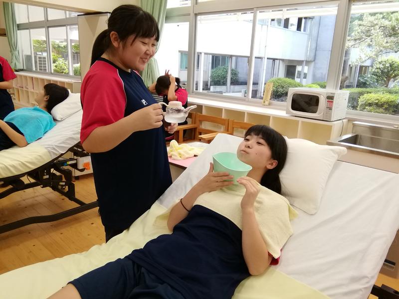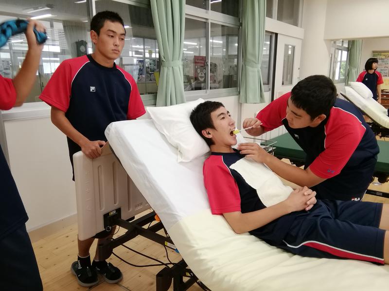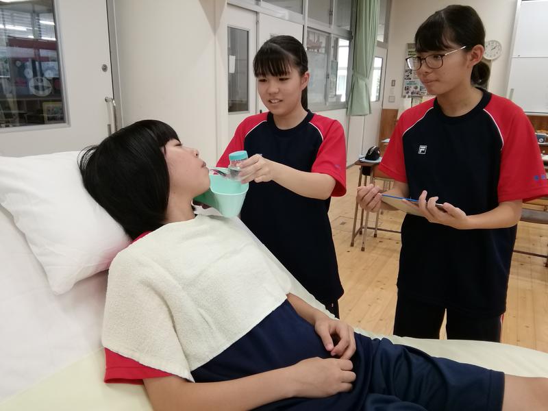 今週は「口腔ケア」を行いました。おそるおそる利用者役のクラスメイトの口の中にスポンジブラシを入れて、歯や口の中をきれいにしました。自分の歯を磨くのとは違って、難しいということがよくわかったようです。
