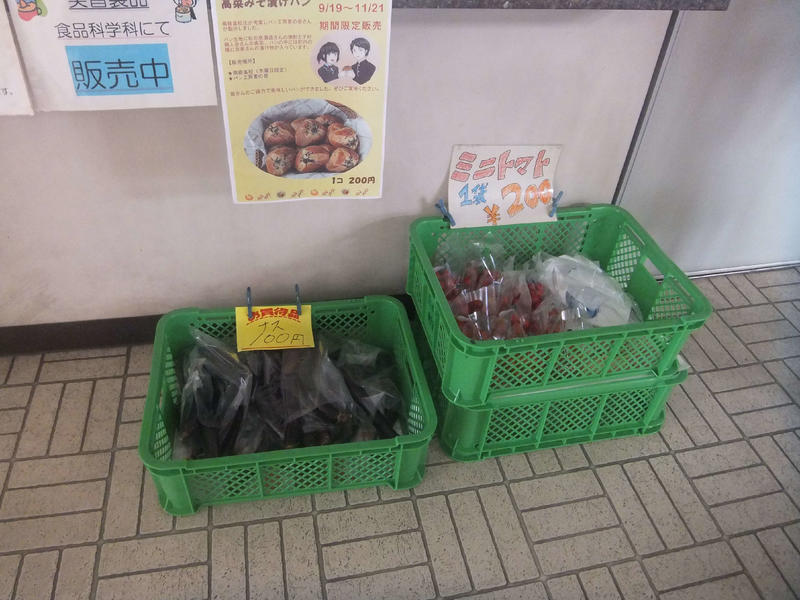 農業高校では生徒たちが自分たちで育てた野菜などを販売に回ったり、事務室前で販売したりします。今日はトマトとナスが販売されていました。