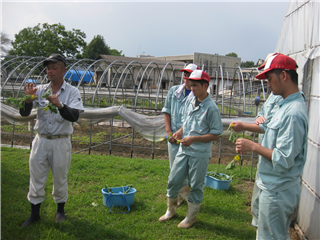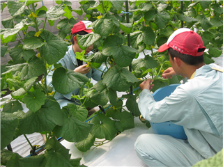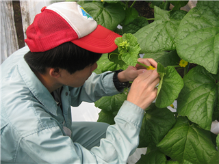 朝晩も冷え込み、秋を感じる季節となってきました。そんな中、アールスメロンの交配を行いました。メインはミツバチ交配ですが、今回人工交配も行いました。雄花を摘み取り花弁を取り除き、雌花の柱頭に優しく受粉。うまくできるといいですね。その後は管理を行い、南稜祭11月10日に販売予定です。交配後の2葉摘心の実践練習も。乞うご期待!!