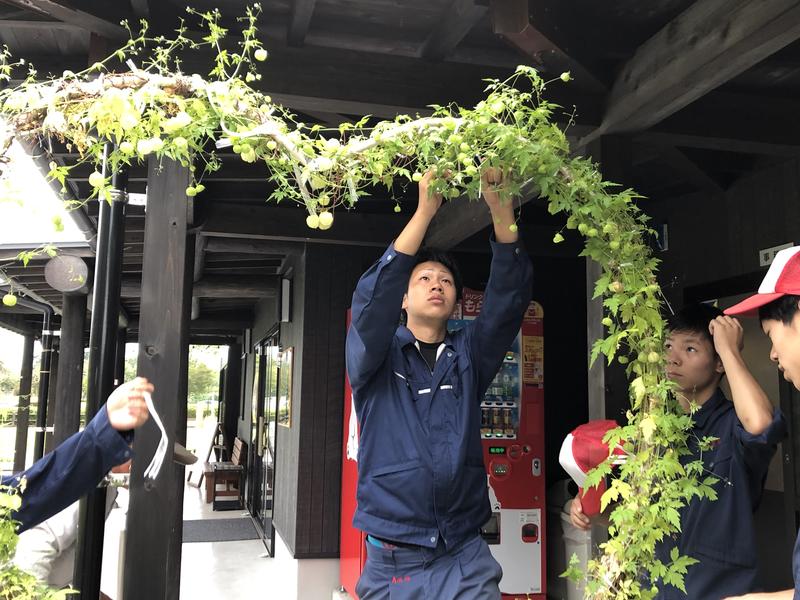 9月20日、総合農業科2年生環境コースの放課後当番実習では、おかどめ幸福駅の美化活動に取り組みました。おかどめ幸福駅には、環境コースで製作したハートの支柱にフウセンカズラのツルがつたって、きれいなオブジェが完成しています