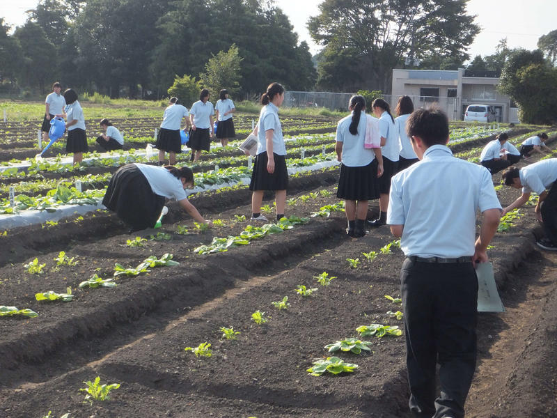 9月25日、放課後の農場は1年生で溢れかえっています。1年生の圃場では総合農業科、食品科学科、生活経営科の生徒たちが秋野菜の栽培に取り組んでいます。各学科とも定植を終え、潅水や除草、生育観察などでたくさんの1年生で賑わっています。