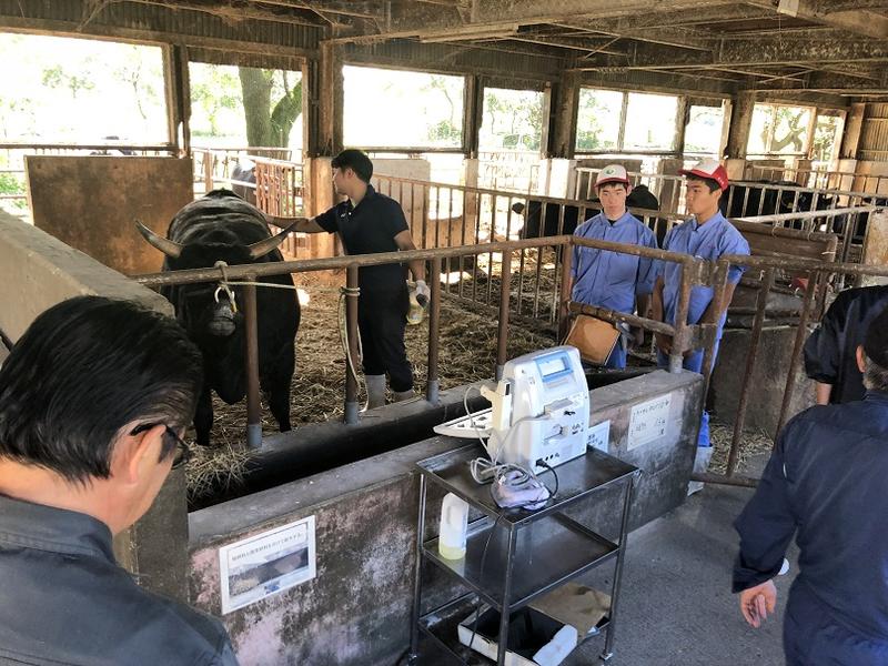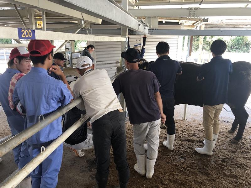 農家の方々の牛を見終わった、南稜高校神殿原農場に来て頂き、和牛甲子園に参加予定の牛2頭もエコーで見て頂きました。7月に宮崎大学の徳永先生に見て頂いた牛です。この2ヶ月での変化、成果を期待します。