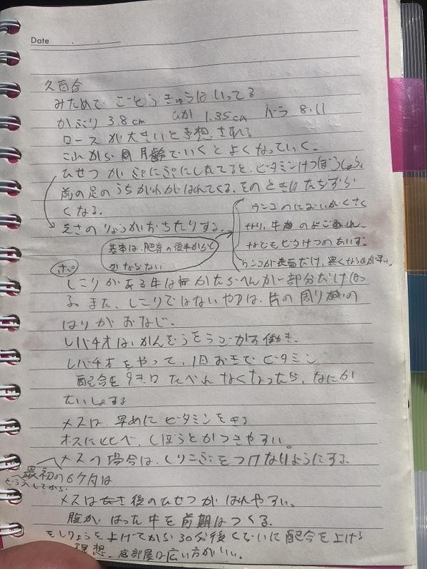 生徒のメモ用紙(勝手にHPに載せてすみません。見事だったもので)。言葉で説明して頂いた内容を、どんどん吸収していました。その姿勢は畜産や牛に限らず、どんな仕事についても求められる、褒められる姿勢です。意欲満々の姿はとても嬉しく思いました。
