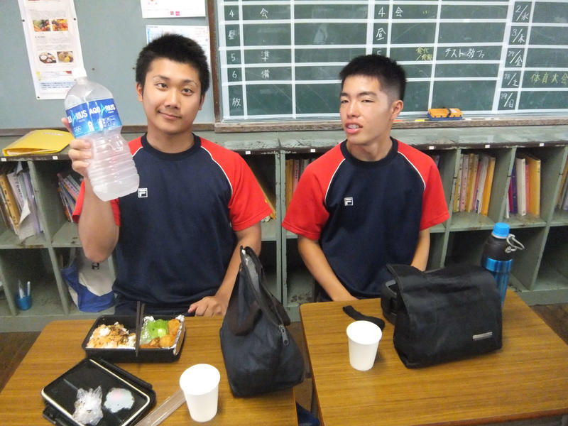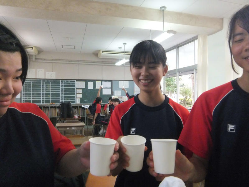 一昨日、3月に卒業した先輩からスポーツドリンクの差し入れがあり、今日、クラス毎にいただきました。今日はとても暑い1日でしたので、さらにおいしい一杯となりました。先輩に感謝し、思い出に残る感動の体育大会にします。