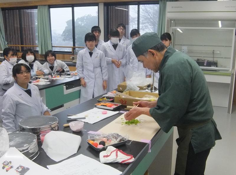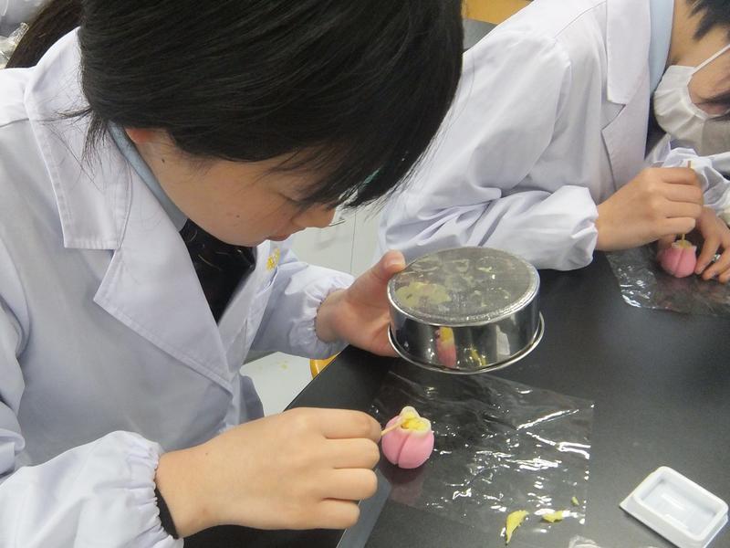 食品科学科では熊本県菓子工業組合で全技連マイスターの河上芳信様におこしいただき和菓子づくりに取組みました。色のついた餡から4種類のお菓子を作り生徒たちも大満足の様子でした。
