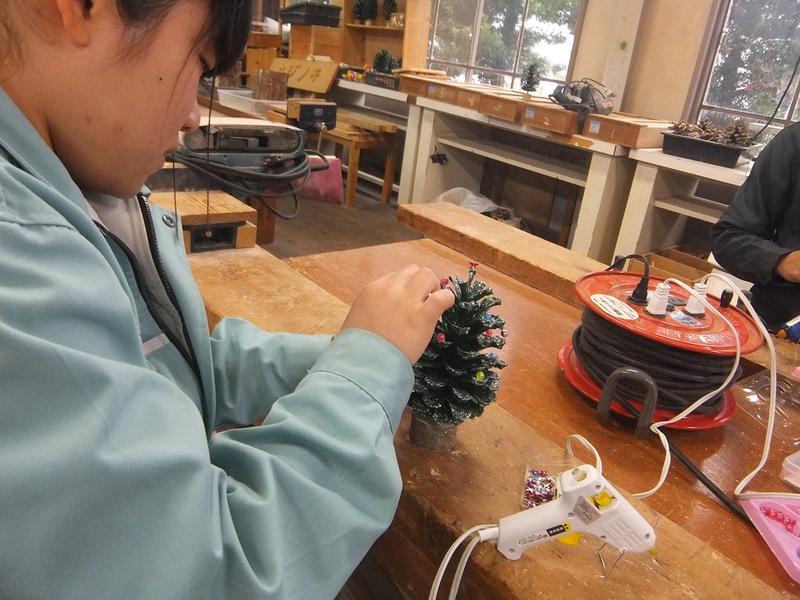 総合農業科3年林業コースの生徒たちが、本校に植栽されている大王松の巨大松ぼっくりを使ってクリスマスツリーを作成していました。
