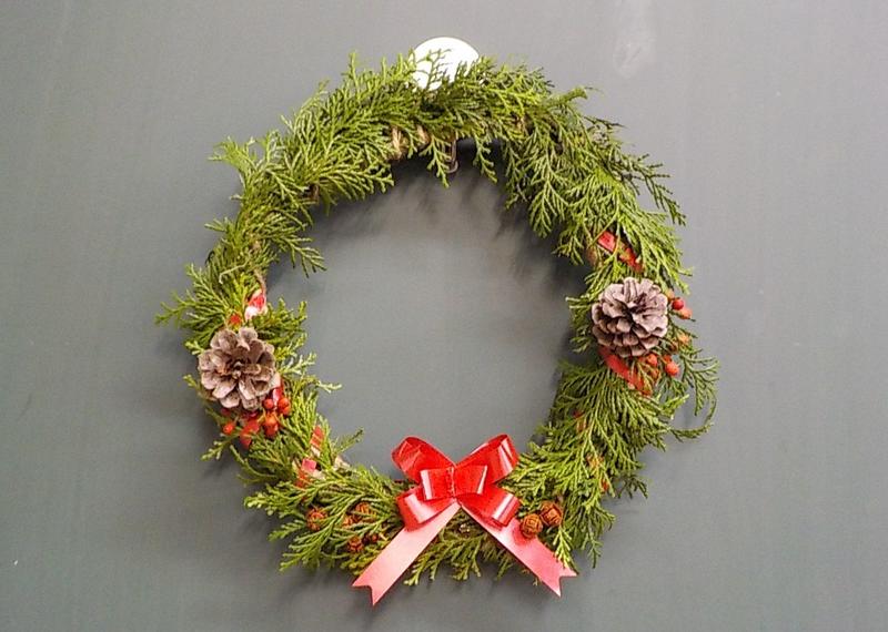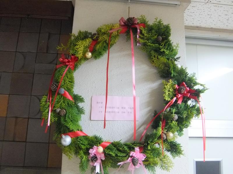 玄関を入った正面に本校生が作った大きなクリスマスリースが飾ってありました。