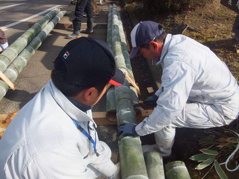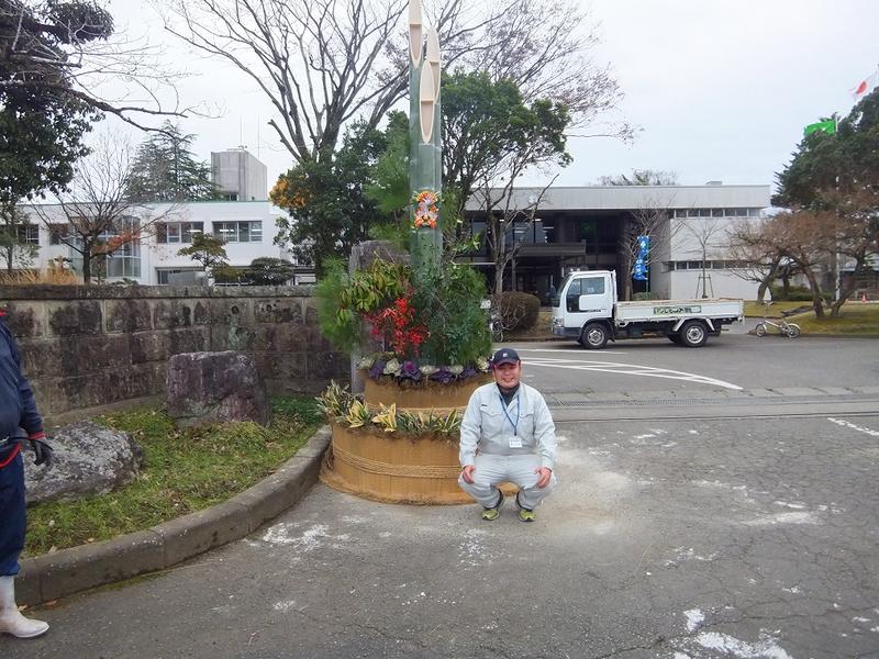 12月14日(木)、正門前に本校職員で門松を作りました。校内にあるや松、梅、南天、それに葉ボタンなどや集めてきた材料で飾り付けました。手馴れた様子で2時間程度で高さ4.5メートルほどの大きな門松を完成させました。