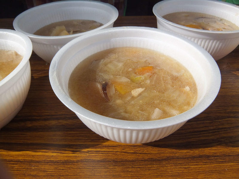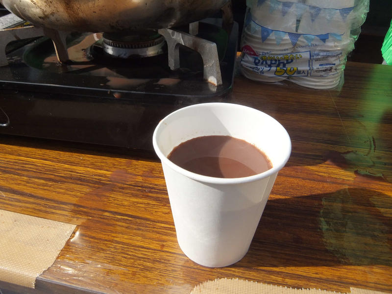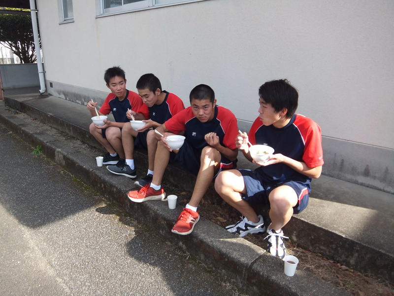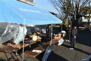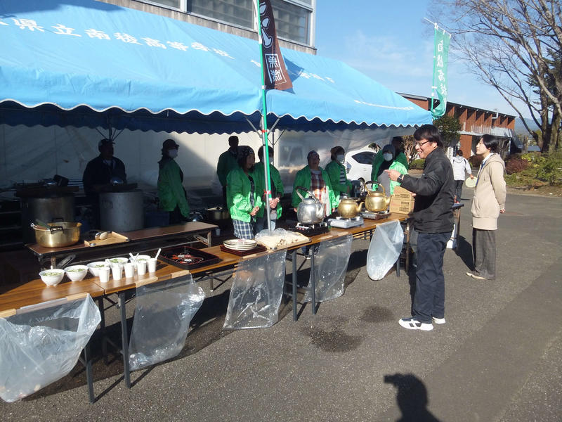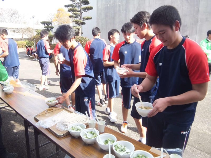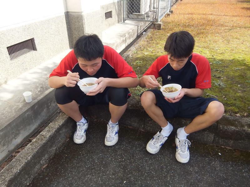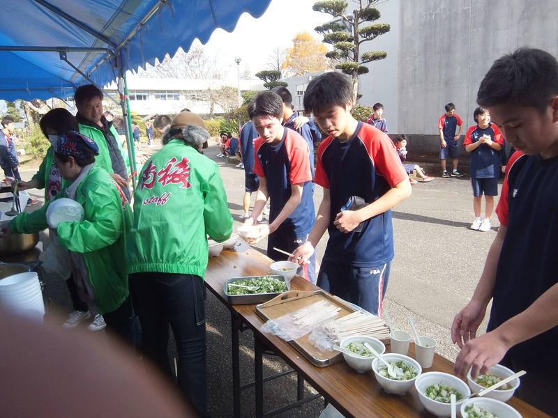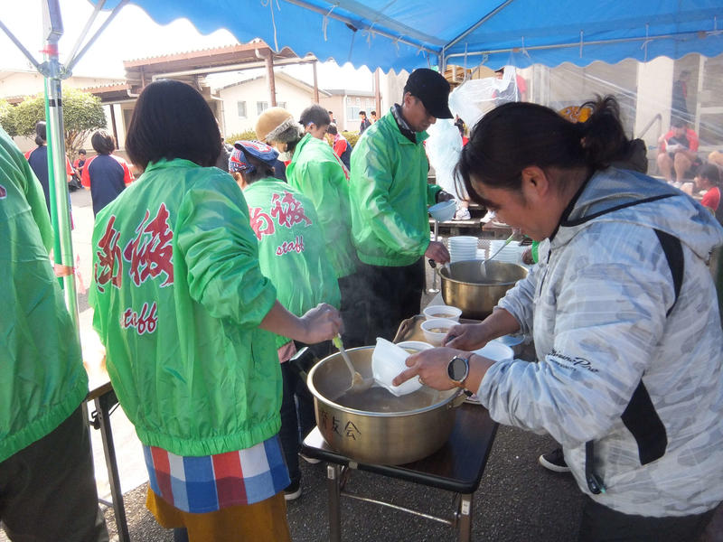 長距離走大会での子どもたちの頑張りを労うため育友会の皆様が豚汁とおにぎり、ココアの炊き出しをしてくれました。とてもおいしく何杯もおかわりをする生徒も見られ、長距離走で疲れた体が癒やされていました。