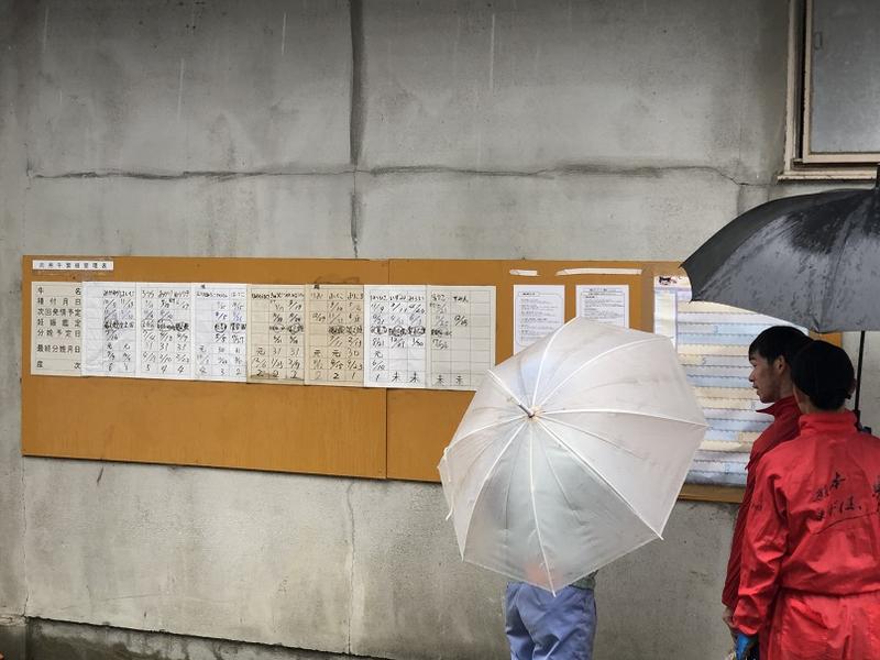 繁殖管理表の前で、「発情」→「人工授精」→「分娩」→「発情」について説明しました。発情周期は21日、平均妊娠期間は285日と説明する牛部の生徒も自分たちの知識を確認するように説明していました。